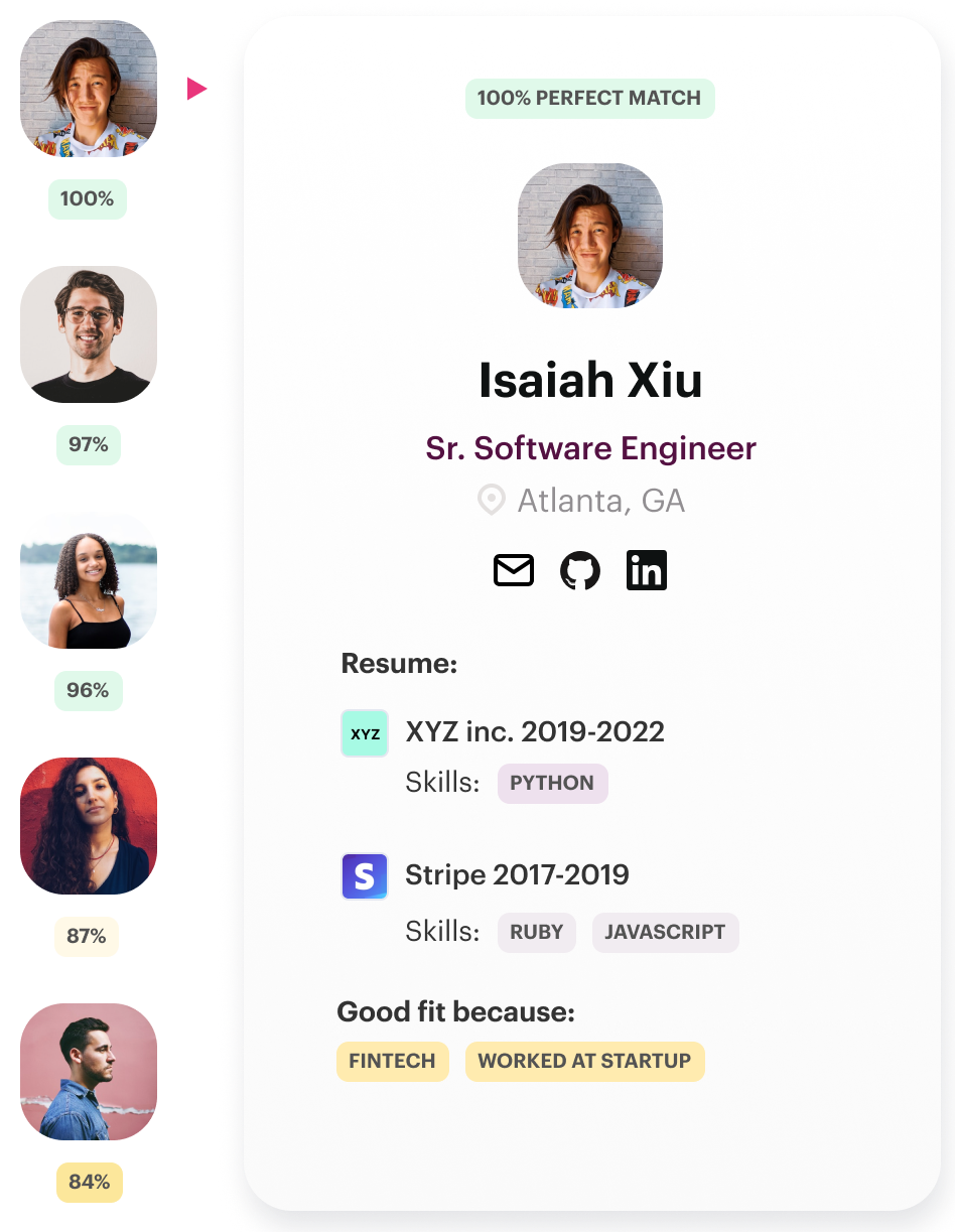 Our AI-powered search goes beyond surface-level keyword match. We aggregate billions of data points to fill in candidate profiles with missing skills and insights about their work experience, so you never miss a fit.